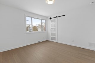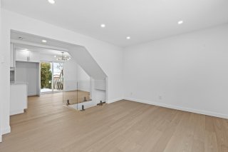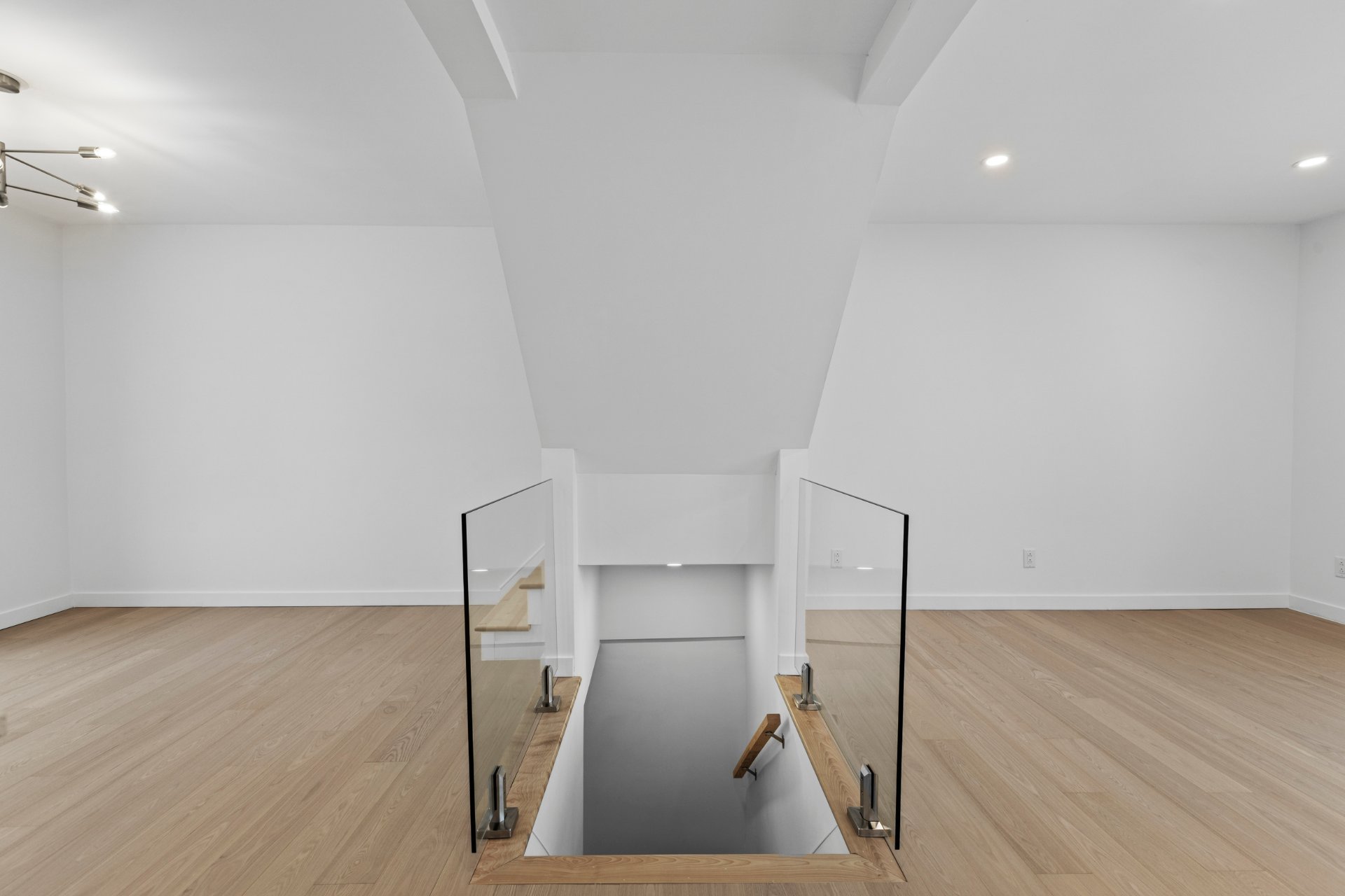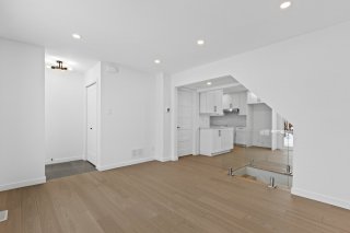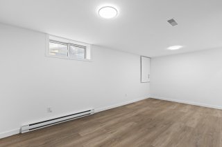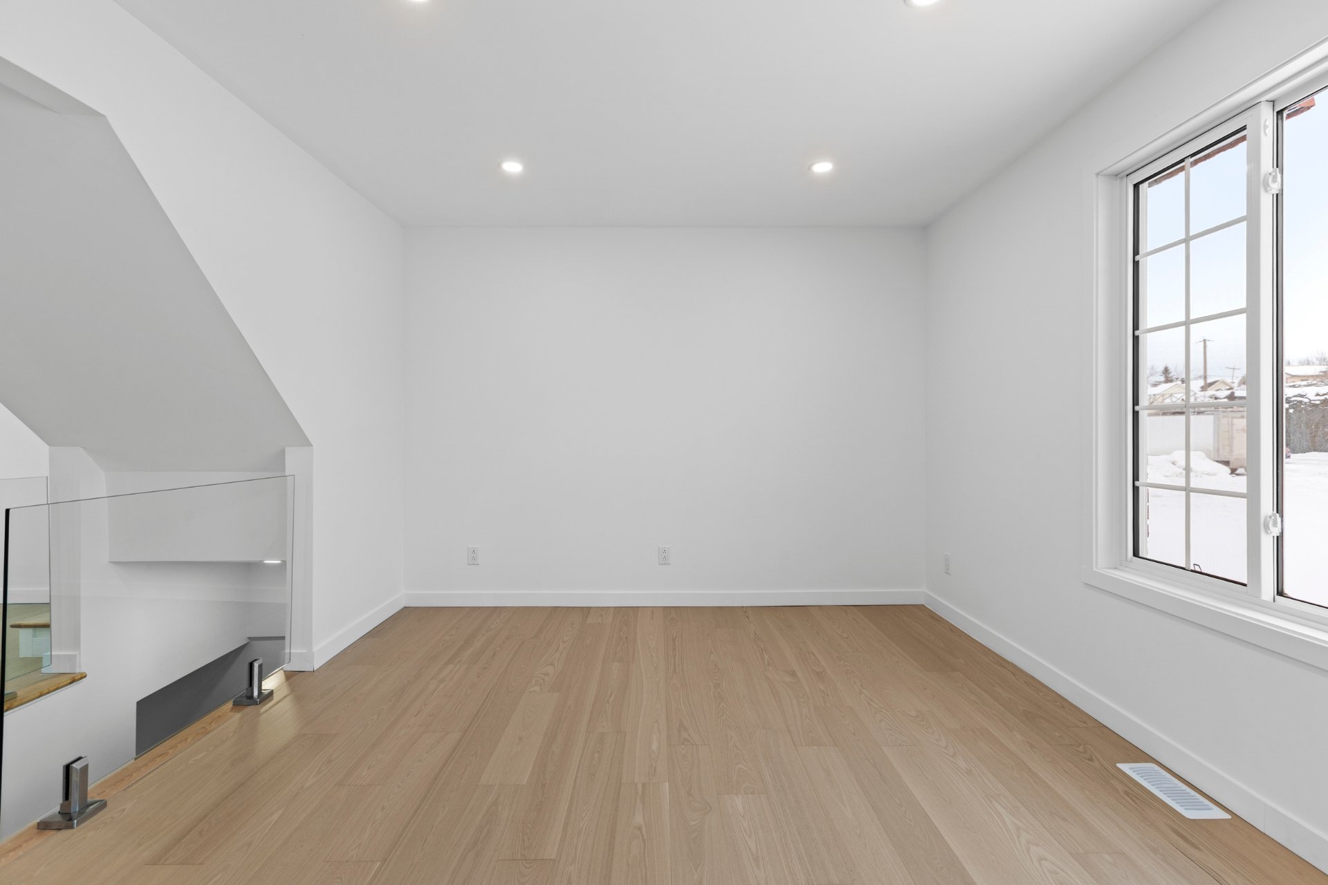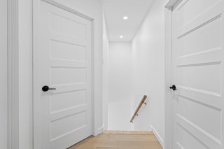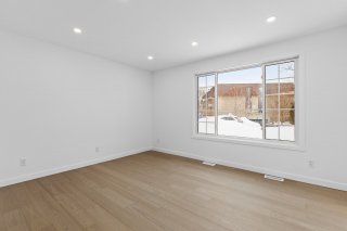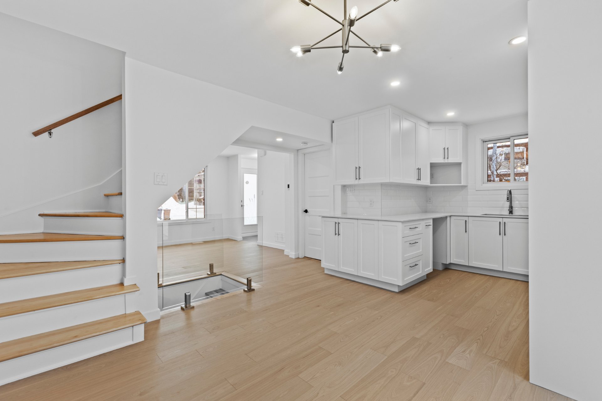 Un élégant escalier avec rampe en verre ajoute une touche architecturale distinctive et mène au sous-sol entièrement aménagé. Celui-ci propose une grande salle familiale polyvalente idéale comme cinéma maison, salle de jeux, gym ou bureau, et bénéficie d'une isolation à l'uréthane pour un meilleur confort et une efficacité énergétique accrue.