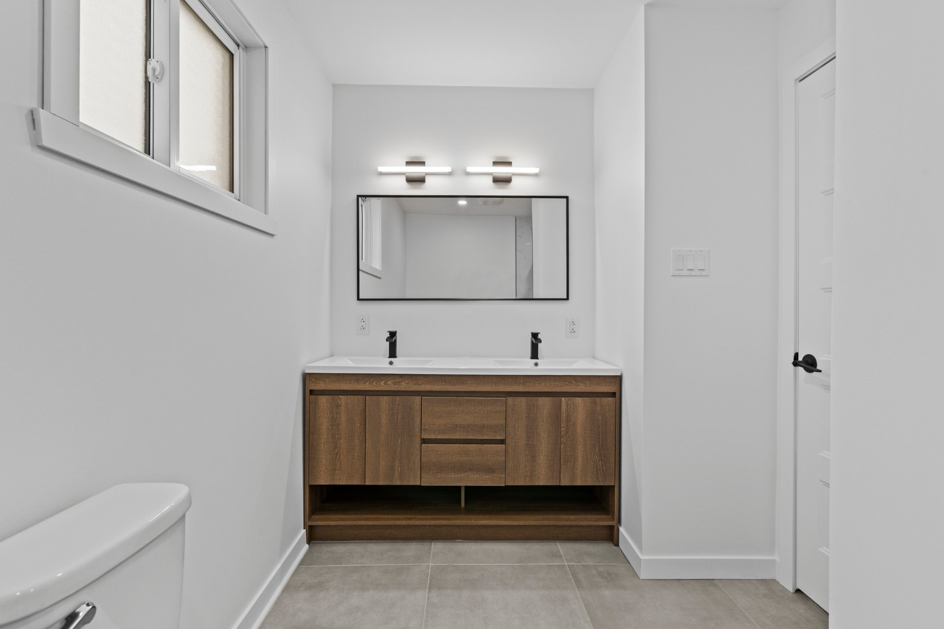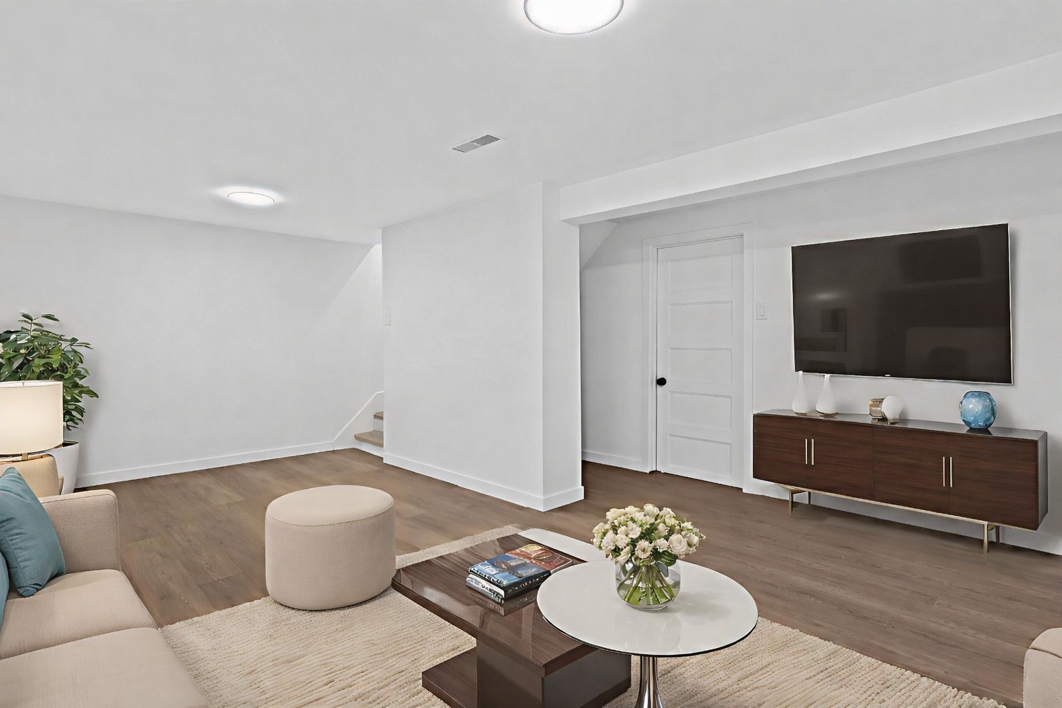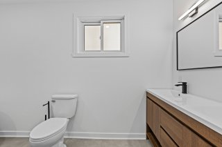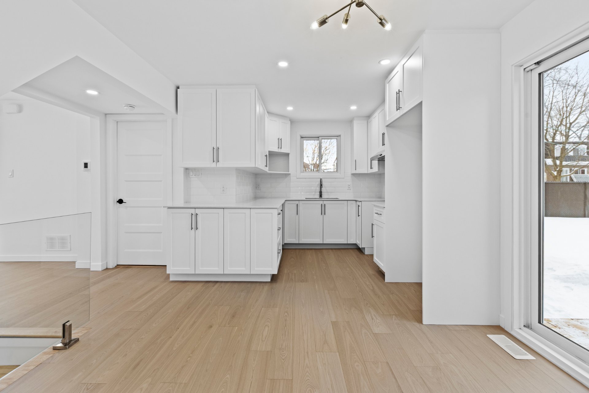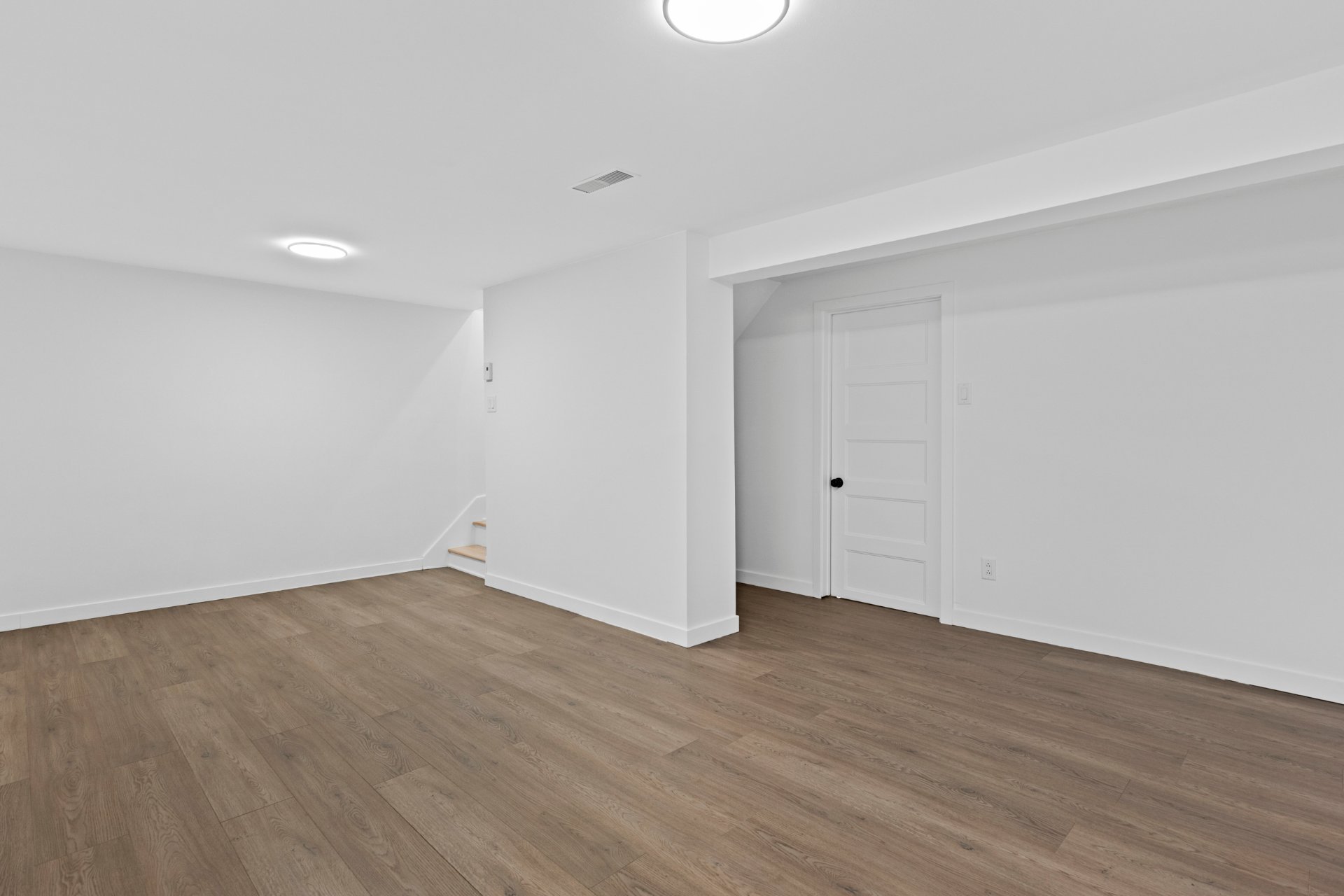 Un élégant escalier avec rampe en verre ajoute une touche architecturale distinctive et mène au sous-sol entièrement aménagé. Celui-ci propose une grande salle familiale polyvalente idéale comme cinéma maison, salle de jeux, gym ou bureau, et bénéficie d'une isolation à l'uréthane pour un meilleur confort et une efficacité énergétique accrue.